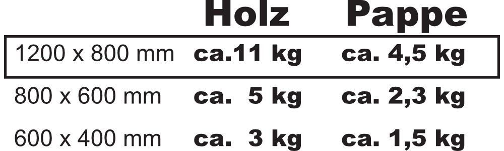 150 kg bei 600 x 400 mm bei 1,20 kg pro Palette